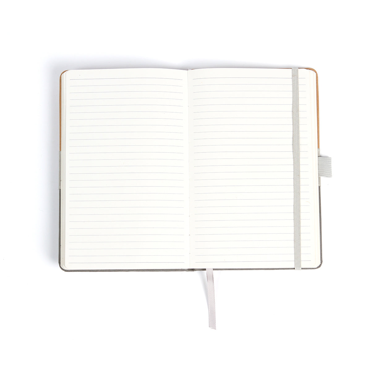 libreta con cubierta en papel kraft lavado y combinado con cartón, incluye un elástico para bolígrafo. papel reciclado de 80g, con 80 hojas forradas y esquina redonda con cierre con banda elástica.