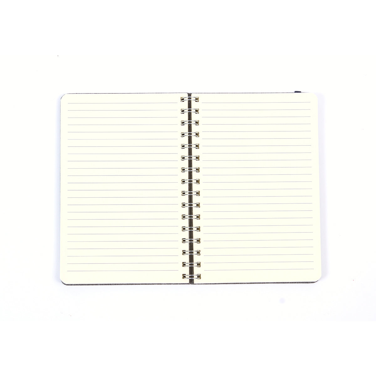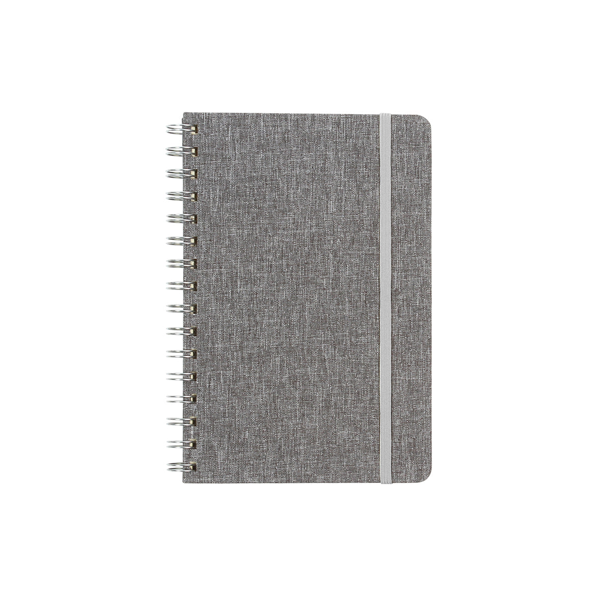 libreta con diseño de espiral medida a5 fabricada con cubierta de pet 300d. incluye 80 hojas rayadas de 70 gramos. cuenta con banda elástica de colores llamativos.