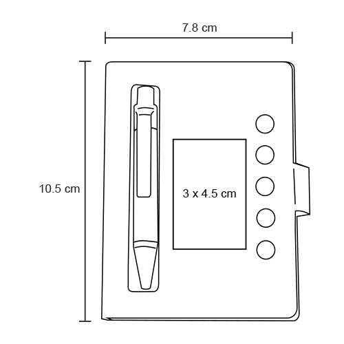 mini libreta de papel reciclado con notas adhesivas y mini bolígrafo, con 80 hojas blancas punteadas.