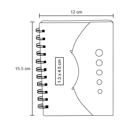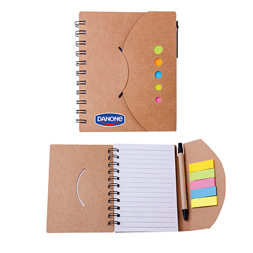libreta de papel reciclado con 70 hojas de raya, notas adhesivas y bolígrafo incluido.