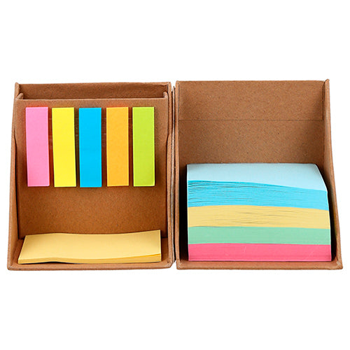 estuche ecológico en forma de cubo. contiene porta plumas, block de hojas cuadradas, block de notas amarillas y 5 tiras de banderas adhesivas de colores.