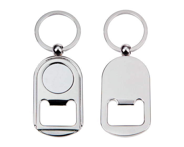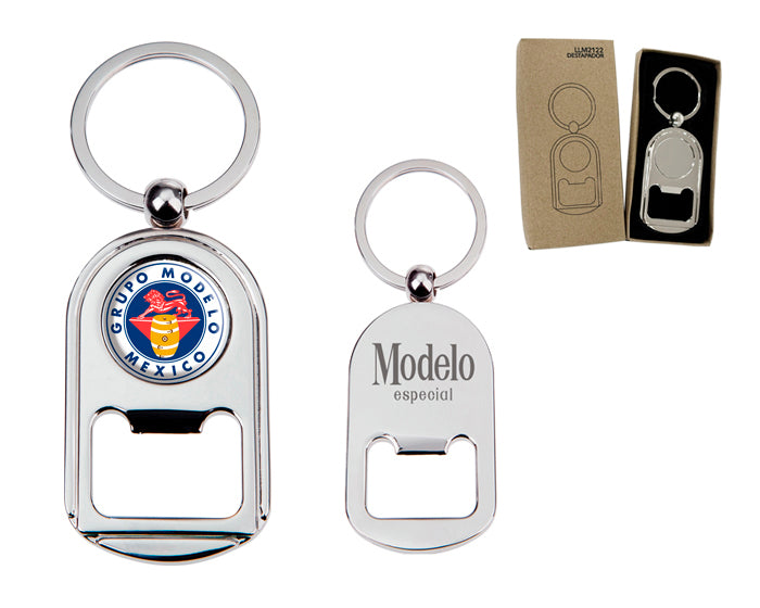 llavero metálico oval con destapador y arillo reforzado. presentación: caja individual de kraft.