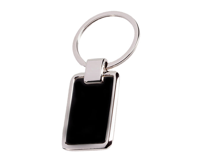 llavero metálico con arillo reforzado y placa de metal color negro para grabado con frente esmerilado y reverso liso. presentación: caja individual de kraft.