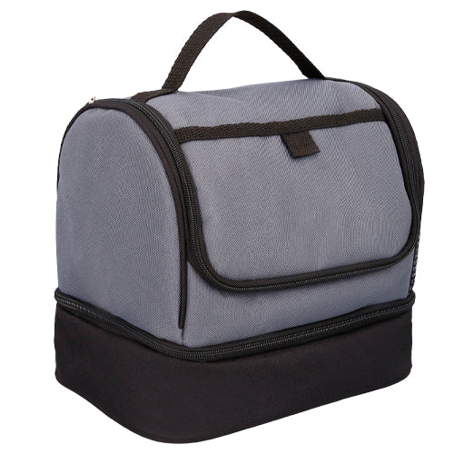 lonchera con 2 compartimentos, interior impermeable plastificado, asa, un compartimento externo al frente y bolsillo lateral de malla.