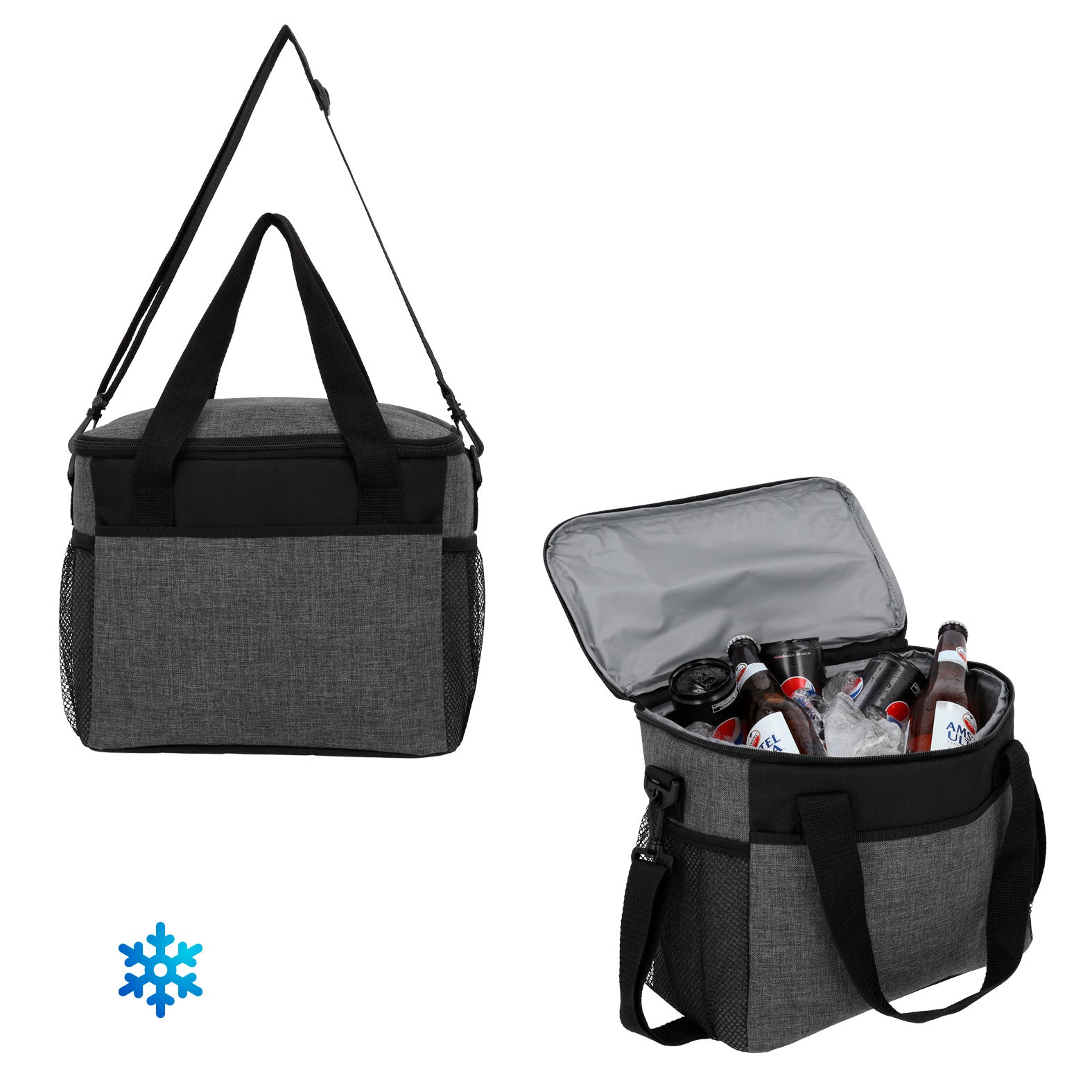 hielera rectangular con interior impermeable plastificado con cierre, 2 asas, 2 mallas laterales, compartimento frontal y correa ajustable.