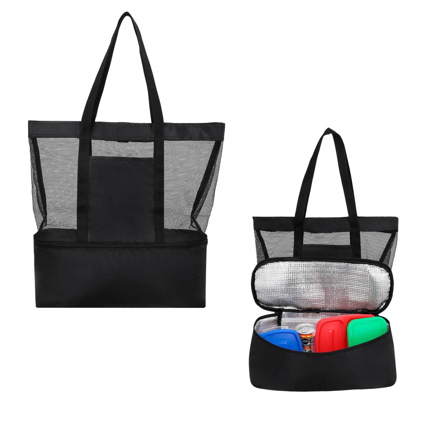 bolsa de red con 1 compartimento principal, 1 bolsa frontal y lonchera metalizada con cierre en la parte inferior, cuenta con 2 asas superiores.
