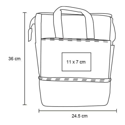 lonchera con 2 compartimentos, 1 compartimento principal con doble cierre, 1 compartimento secundario en la parte inferior, 1 bolsa frontal, 2 bolsas laterales con broche de velcro, destapador, 1 bolsa de malla con velcro en la parte posterior, tirantes ajustables y 2 asas con broche de velcro.