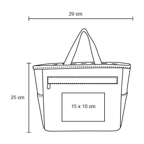 hielera con interior impermeable, cierre, 1 bolsa frontal, 2 bolsas laterales y doble asa superior.