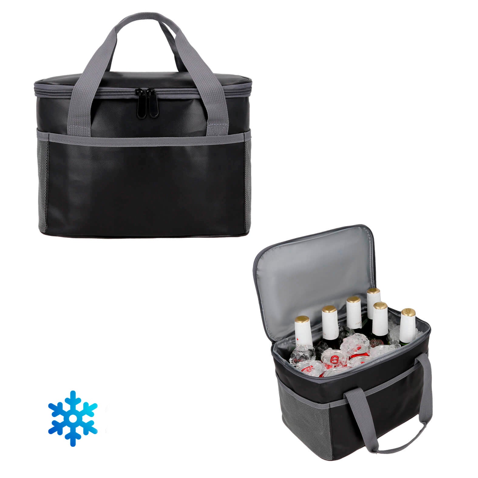 hielera con interior impermeable, doble cierre, 1 bolsa frontal, 2 mallas laterales y doble asa.