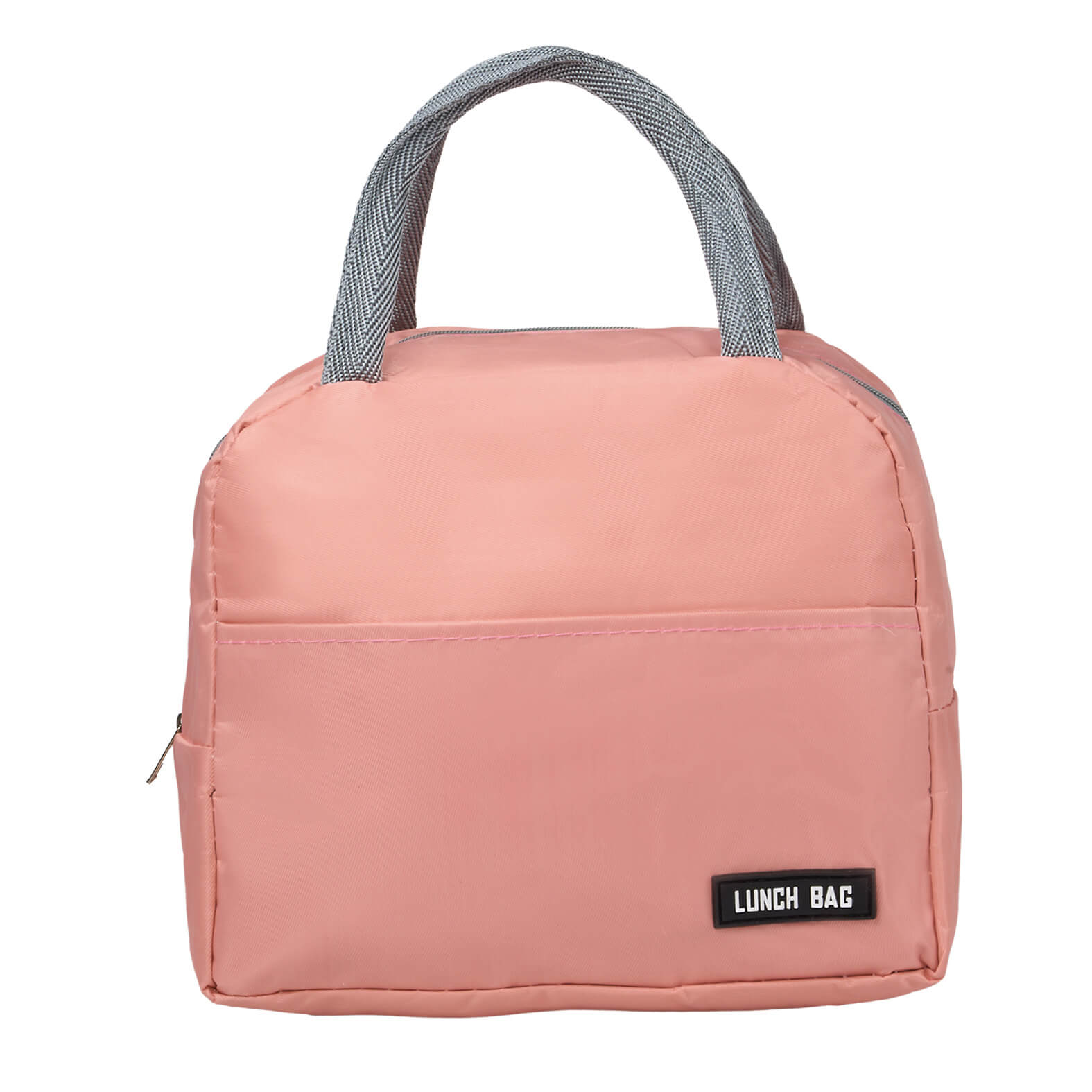 lonchera de poliéster con interior térmico metalizado, bolsa exterior y asa.