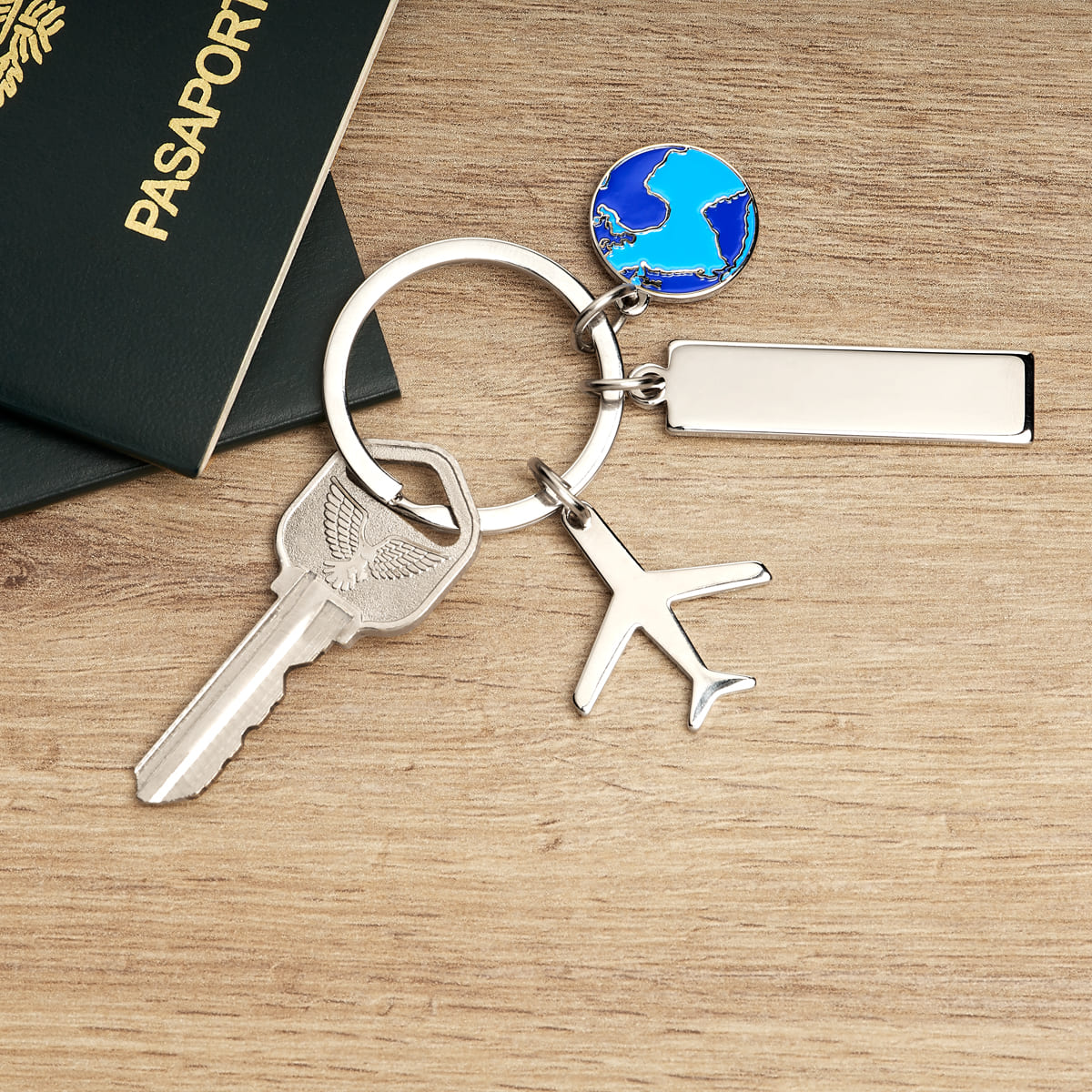 llavero metálico con una placa para grabado, 1 dije de avión y 1 dije de mundo. su diseño evoca el espíritu aventurero y la pasión por los viajes. incluye caja individual.