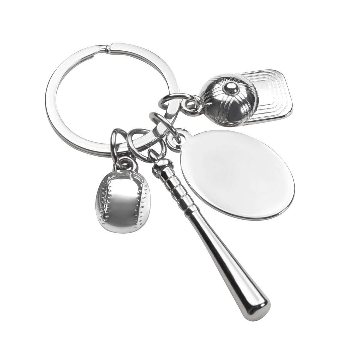 llavero metálico con placa para grabado. incluye 3 dijes con diseño de: bate, pelota y gorra. este llavero es ideal para los apasionados del béisbol. incluye caja individual.