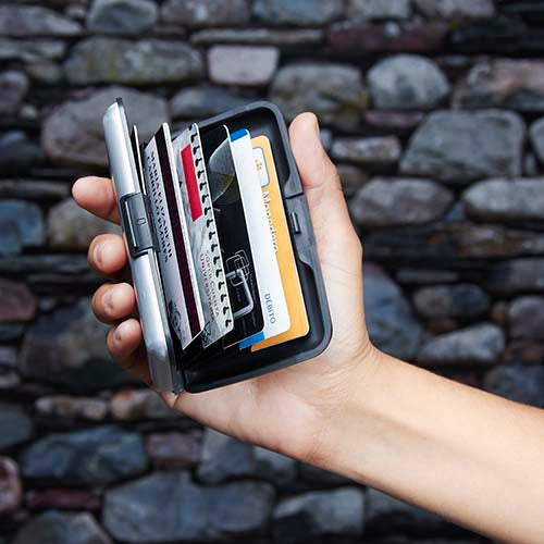 con 6 espacios para tarjetas. sistema anti robo rfid.