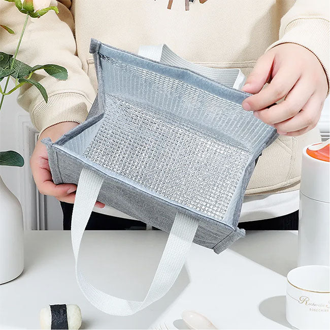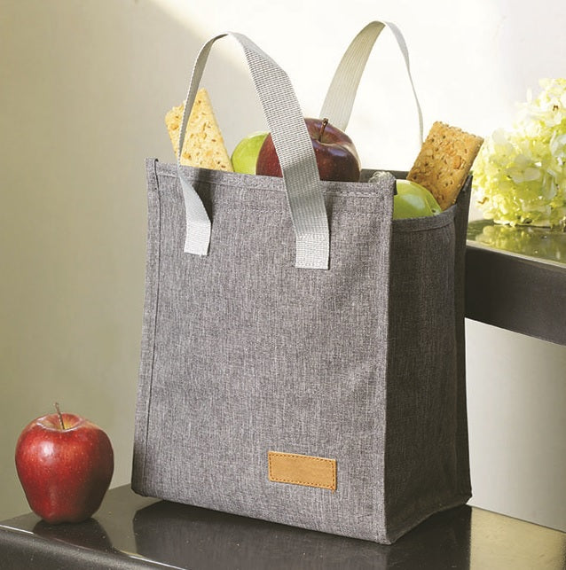 Interior en aluminio insulado. Etiqueta frontal para personalizar. Cierre en velcro. Colores: Gris y Negro.