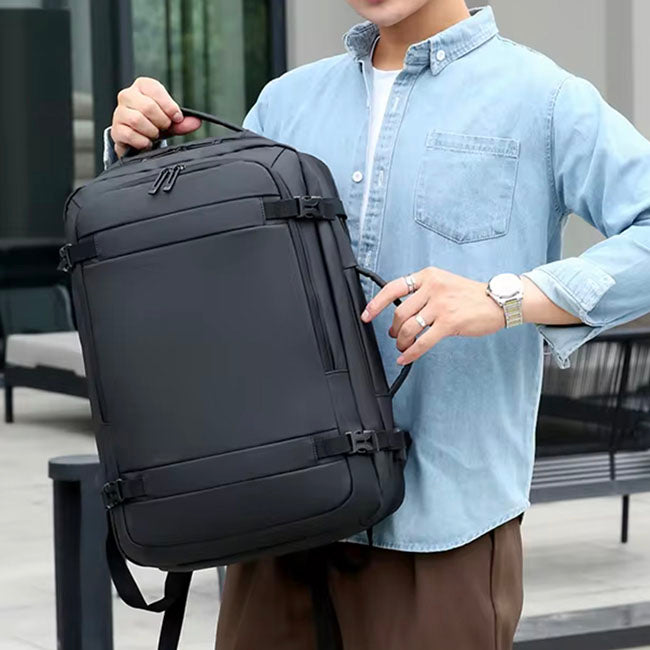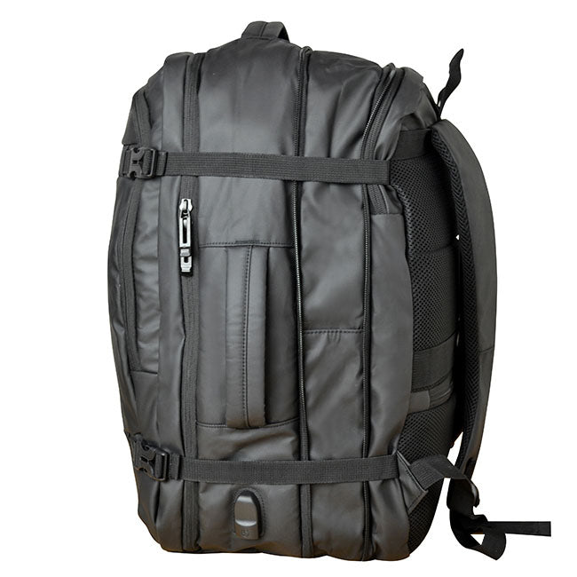 Backpack Ledecky Versátil y funcional: como backpack y maletín de equipaje. Salida lateral para usb. Compartimento principal expandible para artículos de viaje. Amplio bolso al frente con cierre en zipper. Banda posterior que conecta al sistema trolley de equipajes. Asa de mano y lateral reforzadas. Impermeable al agua. Correas ajustables y acojinadas. Compartimento especial para laptop. Colores: Negro.