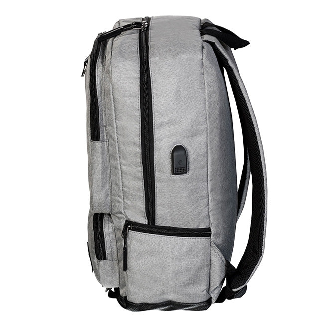 Backpack Murray Salida laterial para USB. Dos amplios bolsos con cierre en zipper. Detalle superior con argolla. Etiqueta inferior para personalizar. Base en terminado curpiel. Bolsillos laterales con cierre. Correas ajustables y acojinadas. Compartimiento interior para laptop.