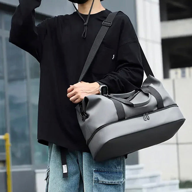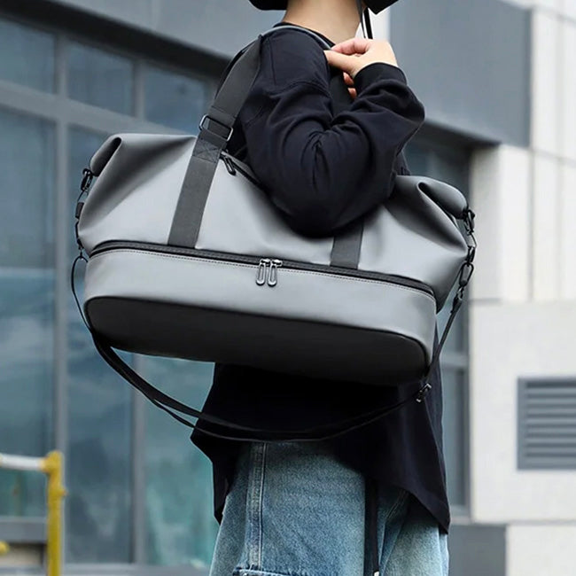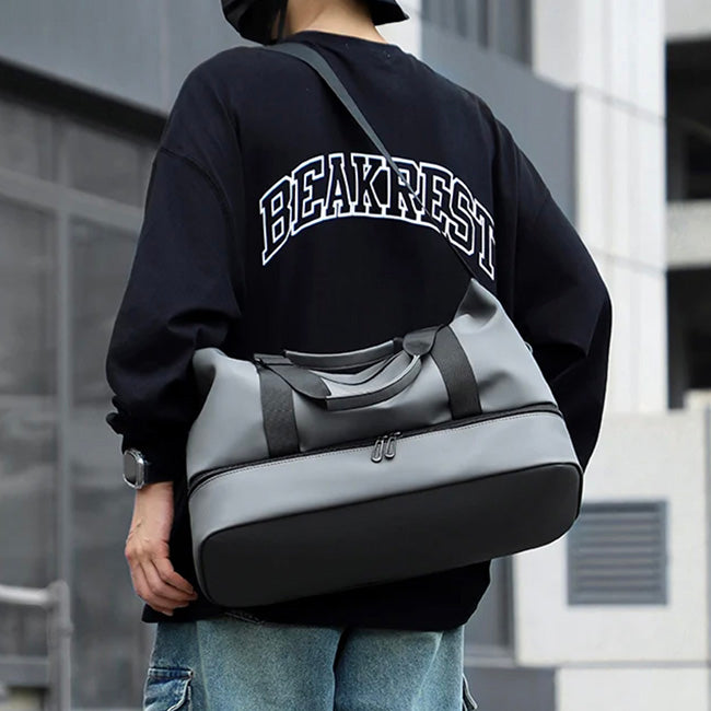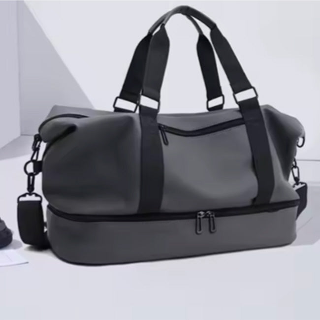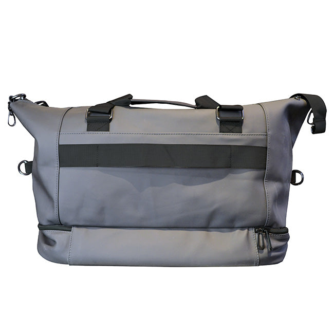 Maletín deportivo Travis l Bolso al frente con cierre en zipper. l Compartimento inferior con cierre en zipper. l Impermeable al agua. l Banda posterior que conecta al sistema trolley de equipajes l Correa corta. l Correa larga ajustable. l Colores: Gris