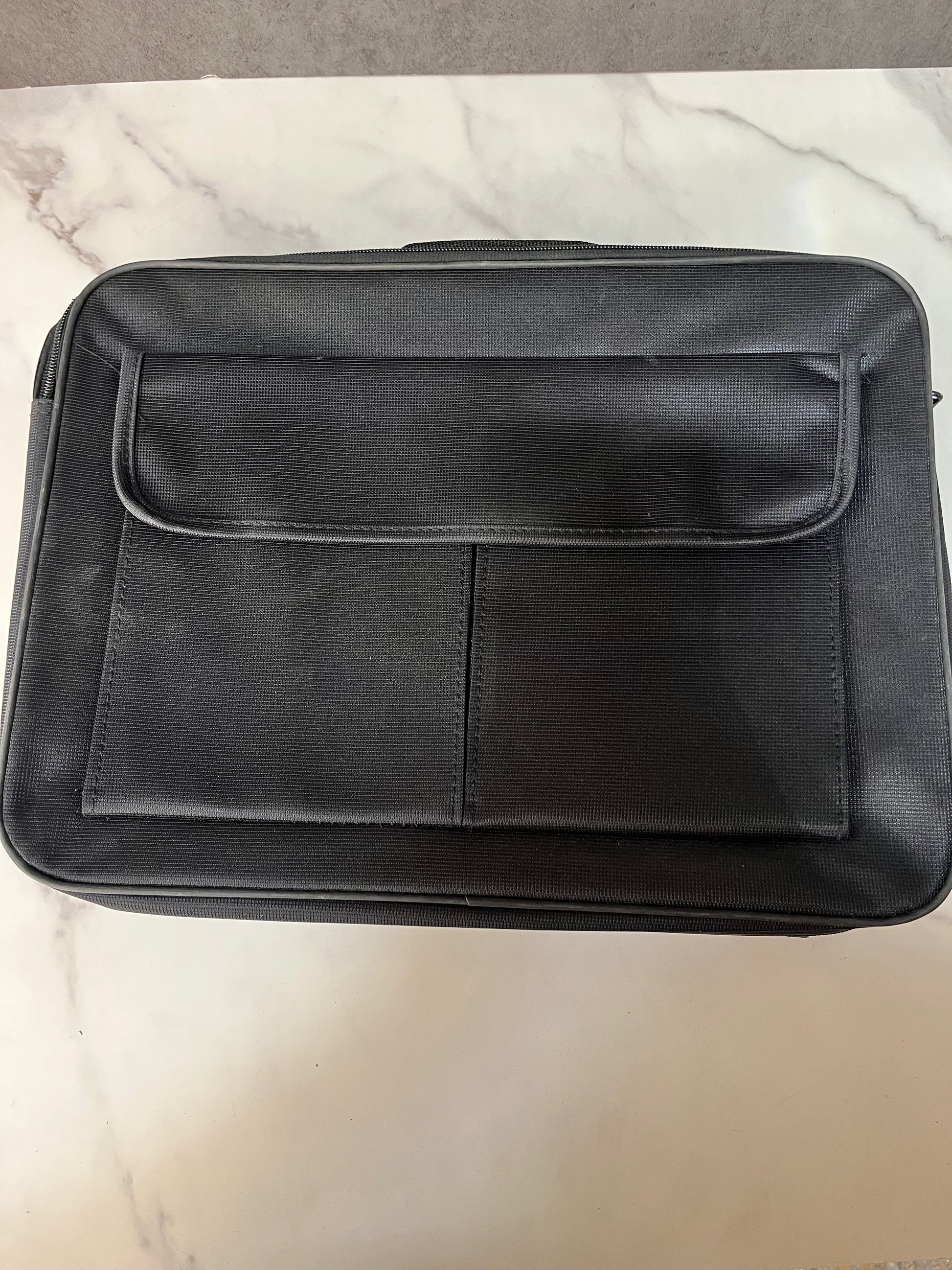 Maletin de poliester con variedad de compartimientos de cerre, asa superior y correa de hombro ajustable, ideal para portar laptop.