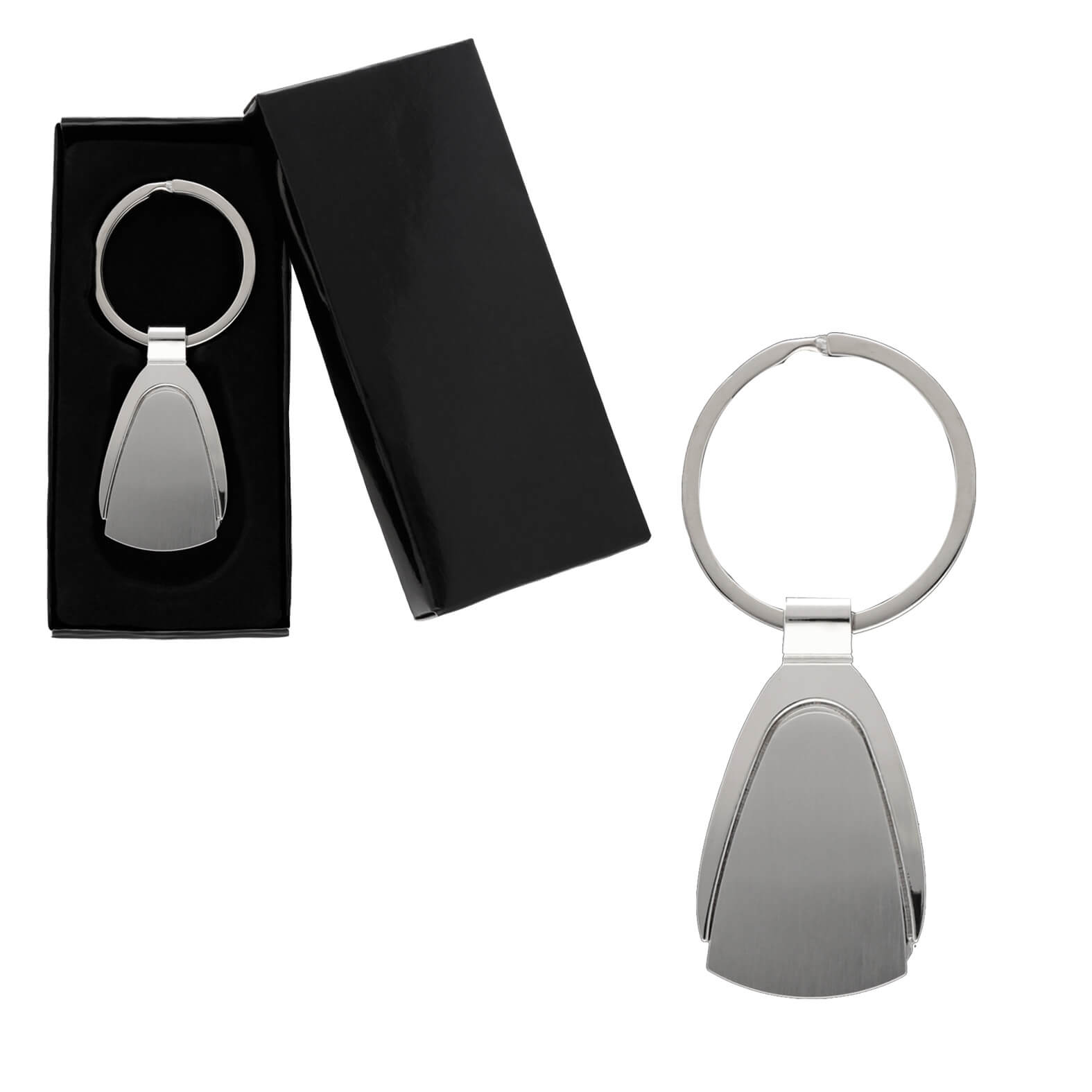 llavero metálico semi ovalado con relieve y arillo reforzado.