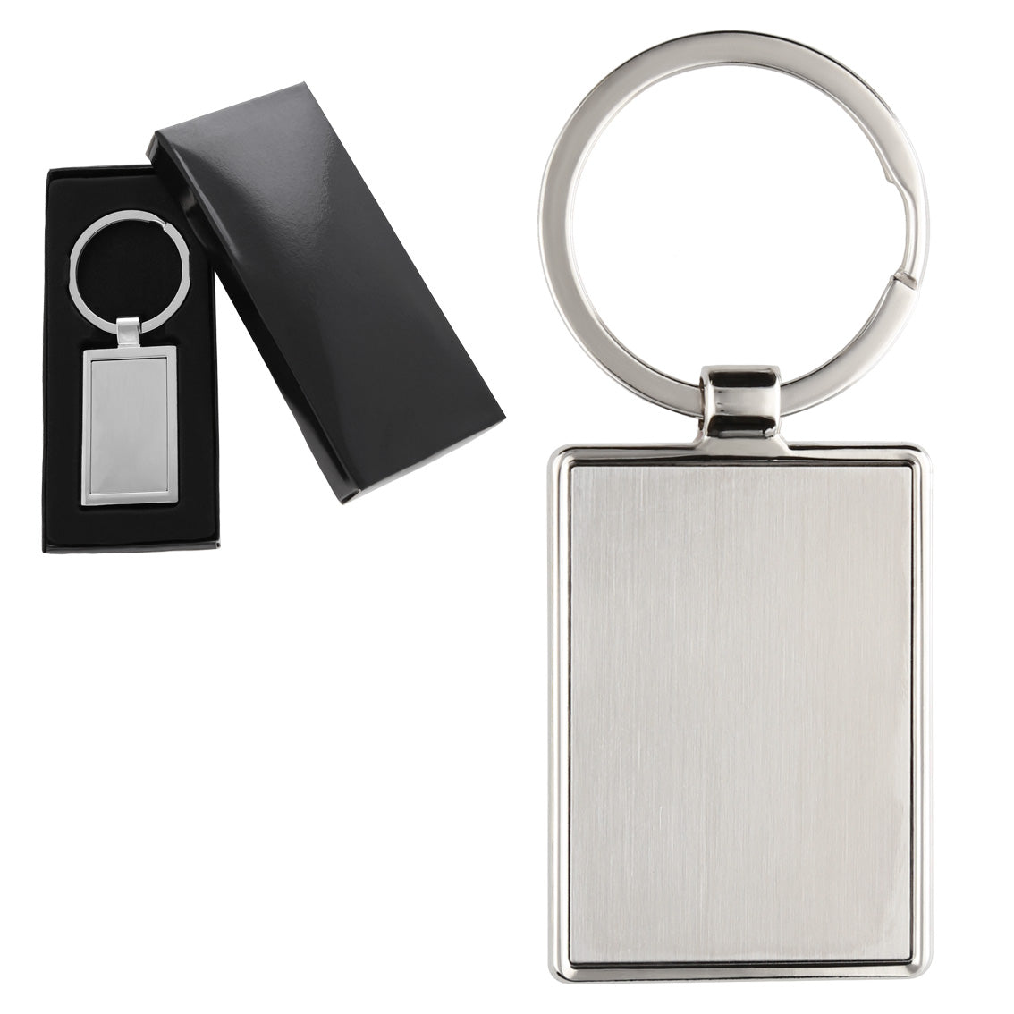 llavero metálico de placa solida en forma rectangular con arillo reforzado.