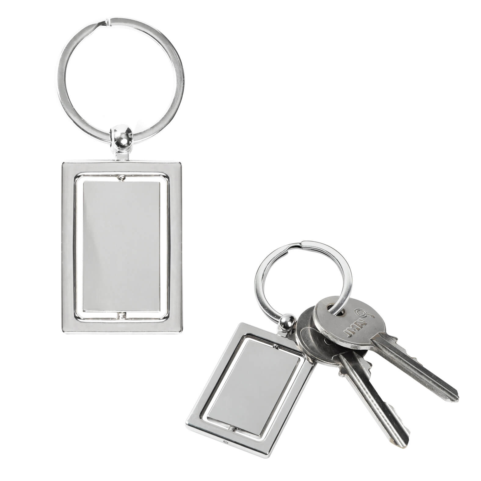 llavero metálico de forma rectangular con centro giratorio y aro reforzado. incluye caja.