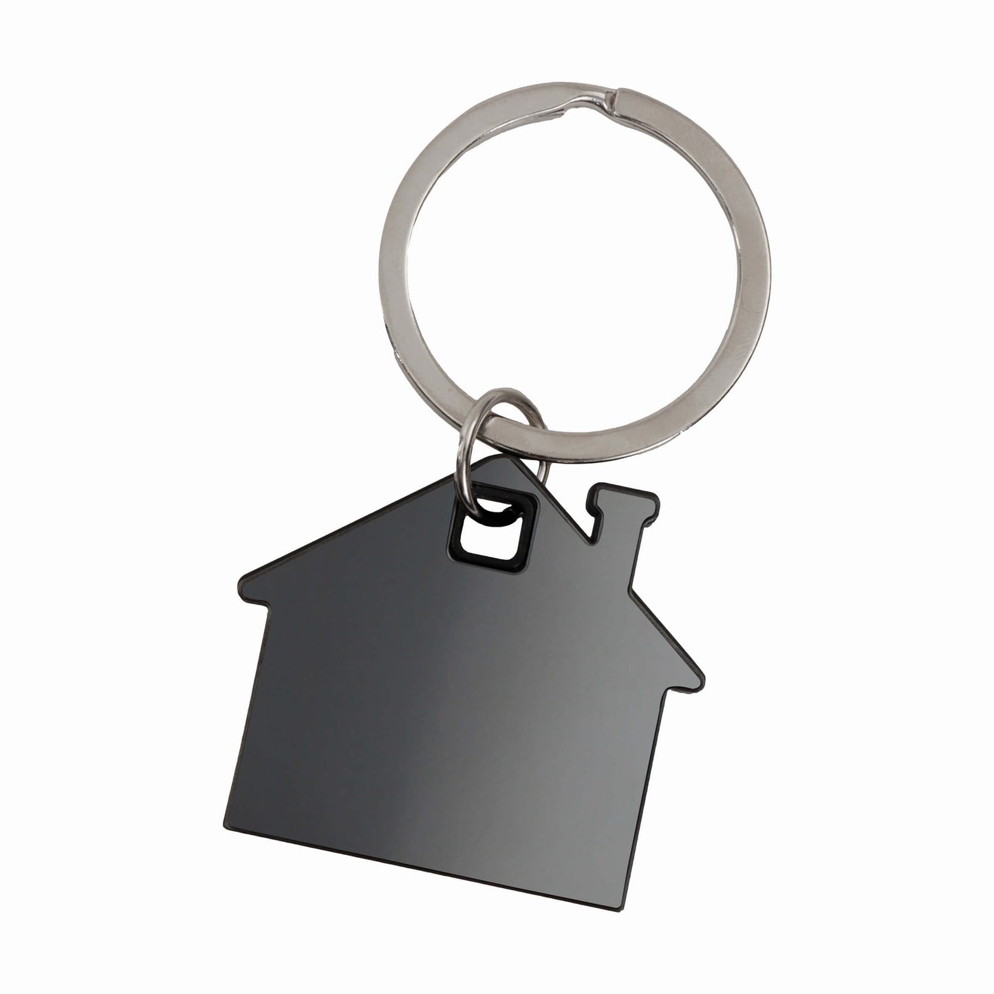 llavero metálico con diseño en forma de casa y acabado espejo.