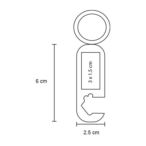 llavero metálico rectangular con diseño interno en forma de casa que sirve como destapador.