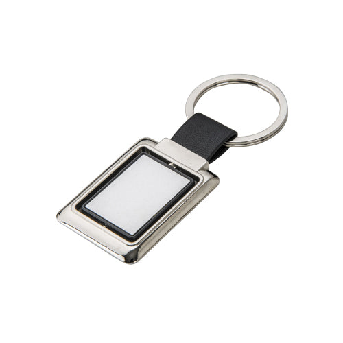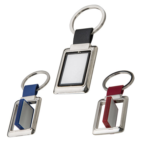 llavero metálico de forma rectangular con centro de color, giratorio, cinta y arillo reforzado para colgar.