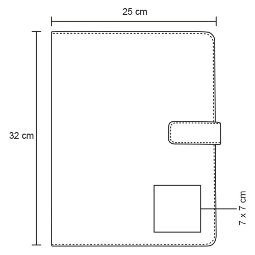 carpeta de curpiel con block tamaño carta de rayas, compartimiento de tarjetas, porta bolígrafo y cierre magnético.