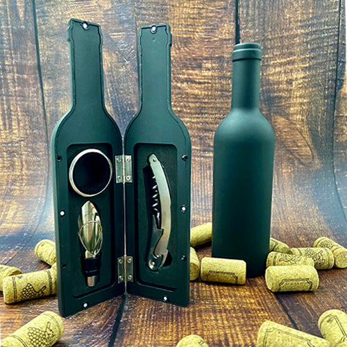 set de vino con acabado rubber. incluye sacacorchos de acero inoxidable, boquilla y corta gotas.