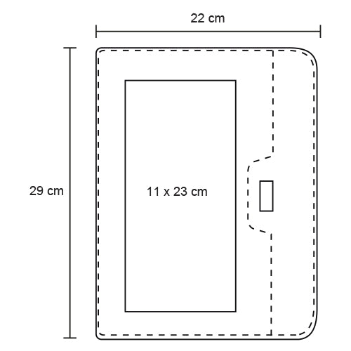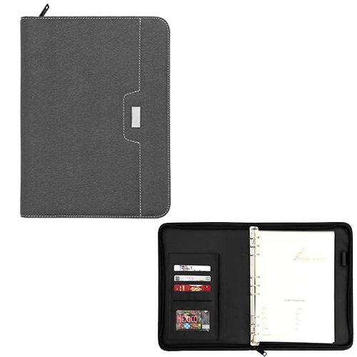 carpeta de poliuretano con cierre de broche, porta tarjetas, hojas rayadas y arillo metálico.