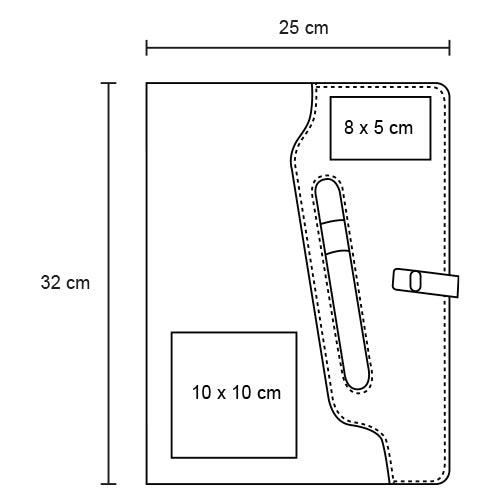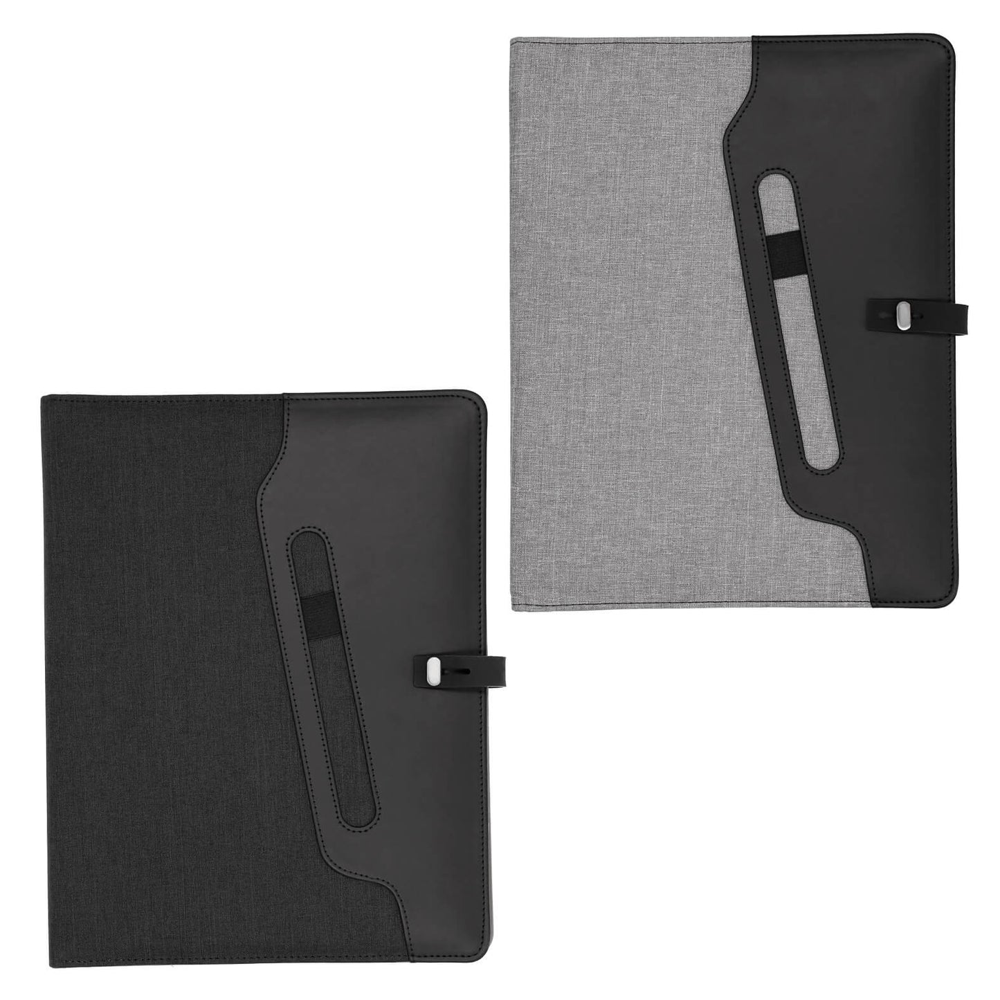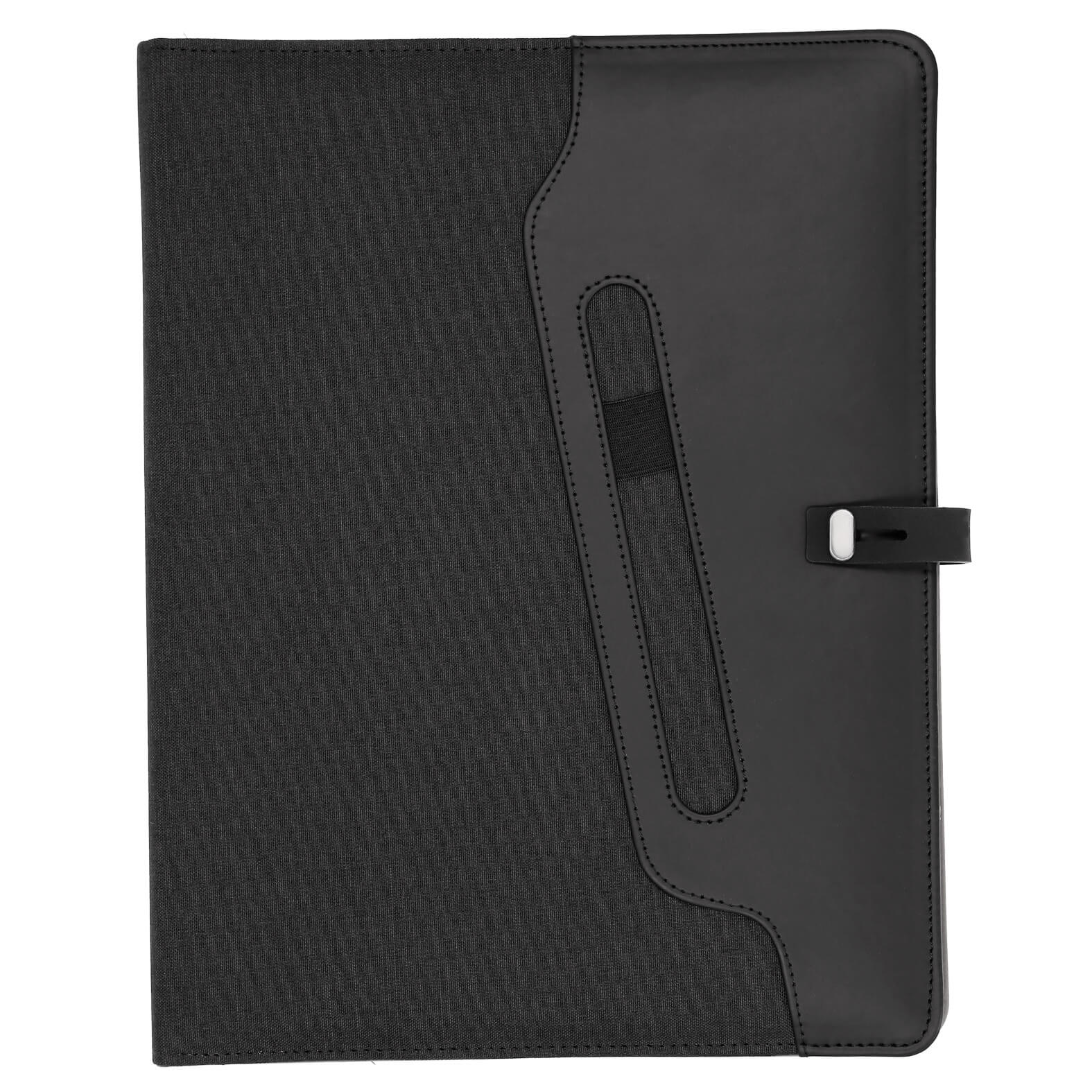 carpeta multiusos con exterior de poliéster, broche y compartimento externo para bolígrafo. cuenta con block de notas tamaño carta de 30 hojas rayadas, cintas elásticas para sujetar smartphones y memorias usb u otros accesorios, compartimento con ventana plástica para credenciales, divisiones para tarjetas y bolsa de malla.