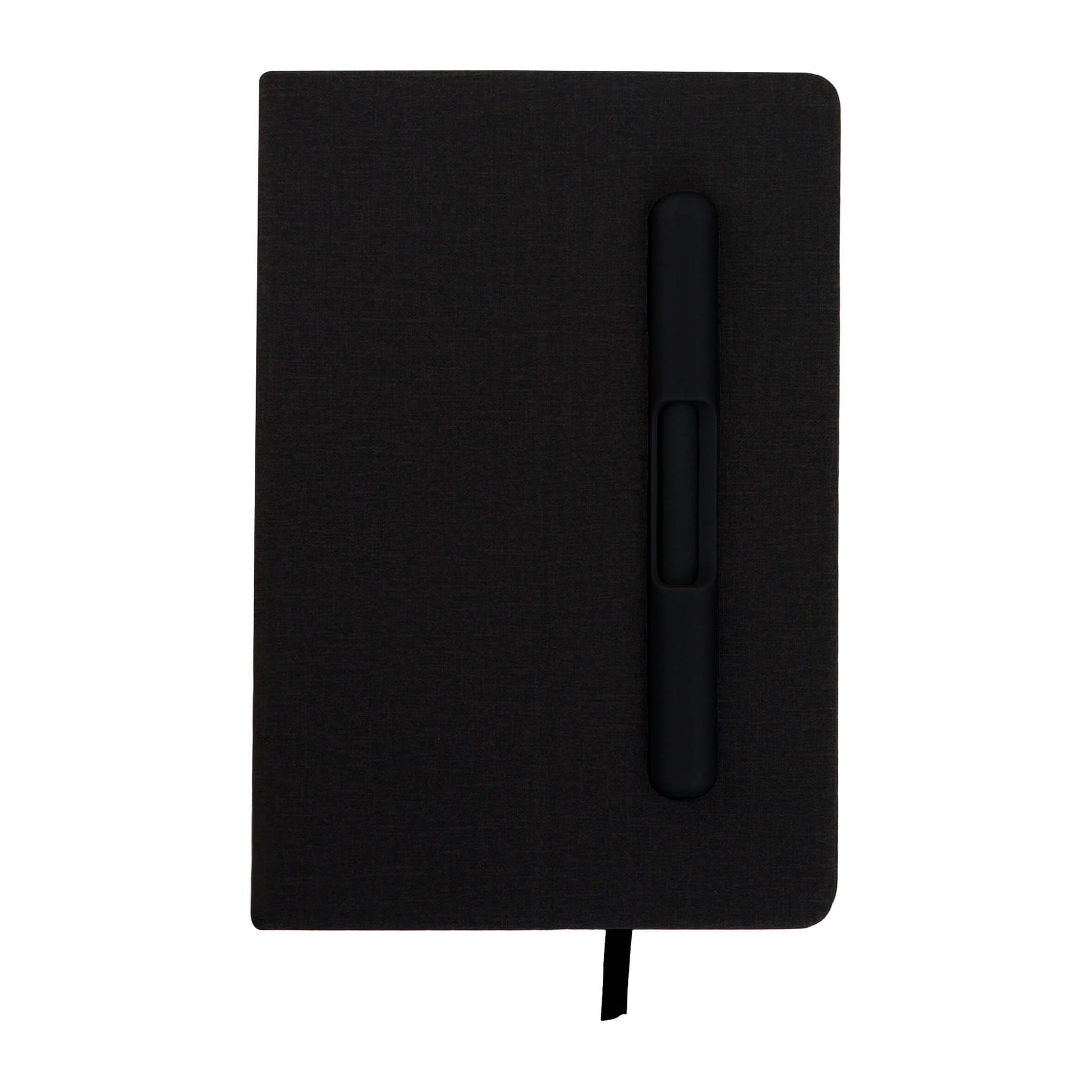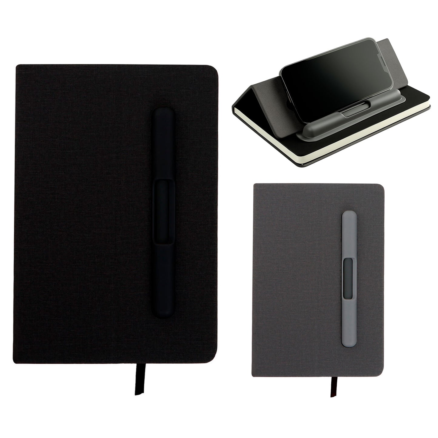 libreta de poliuretano con 98 hojas rayadas, separador, bolígrafo y portada ajustable que sirve como soporte para celular.