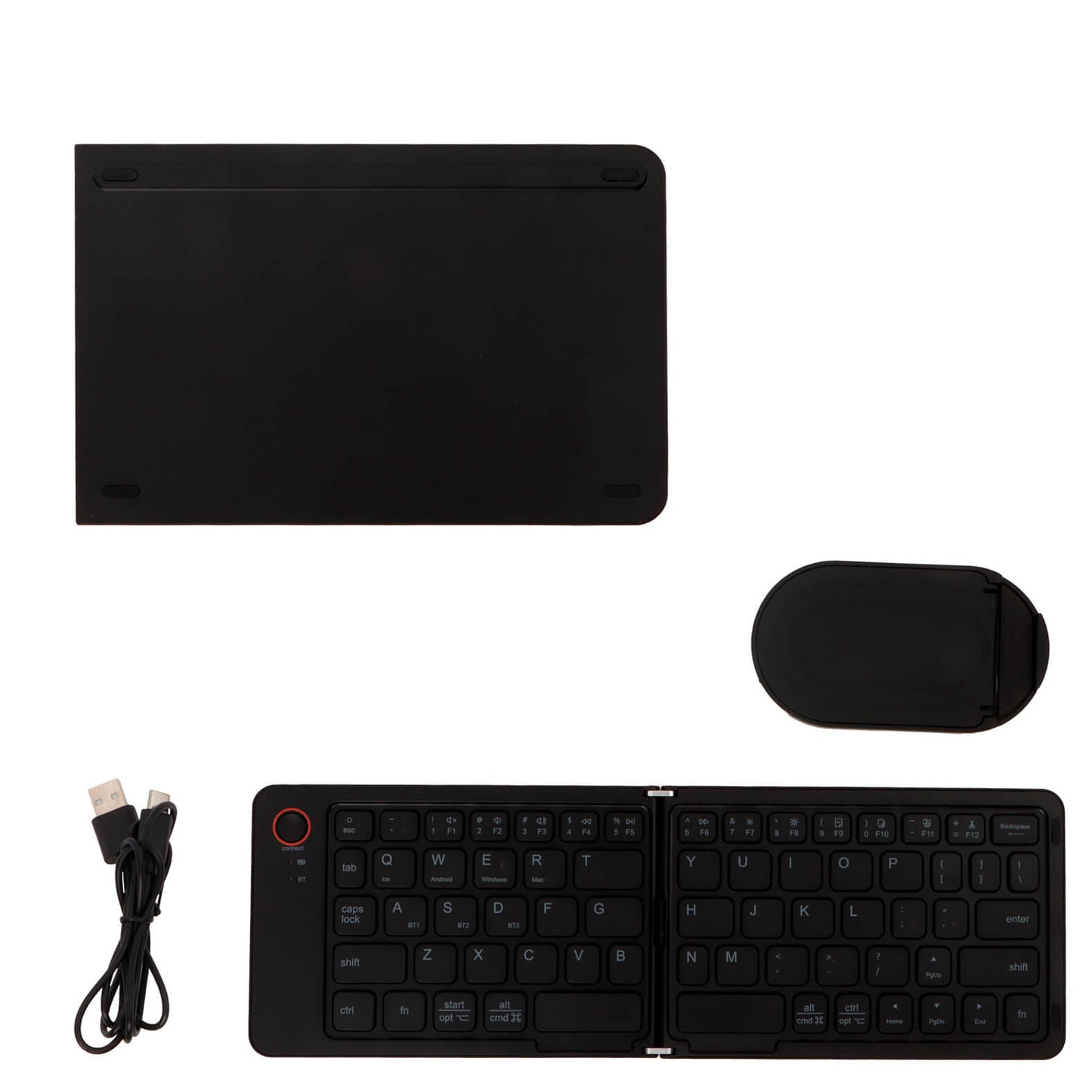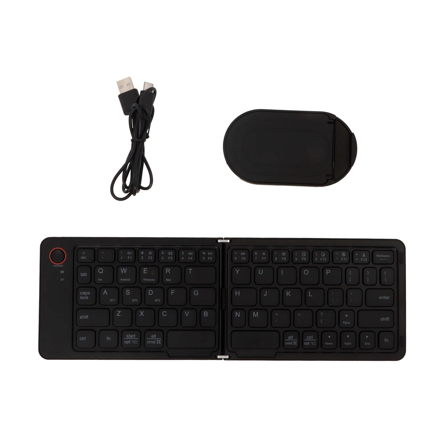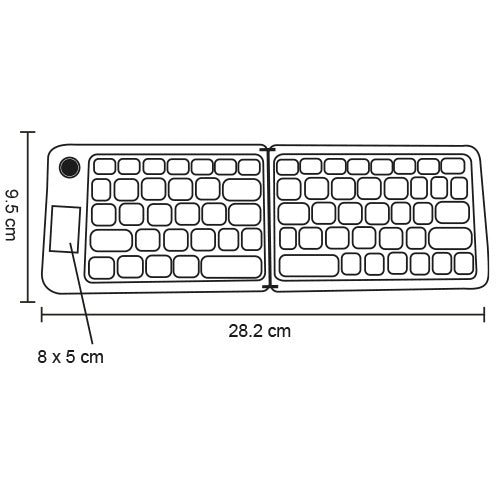 teclado inalámbrico plegable con botón de conexión. incluye soporte y cable de carga.