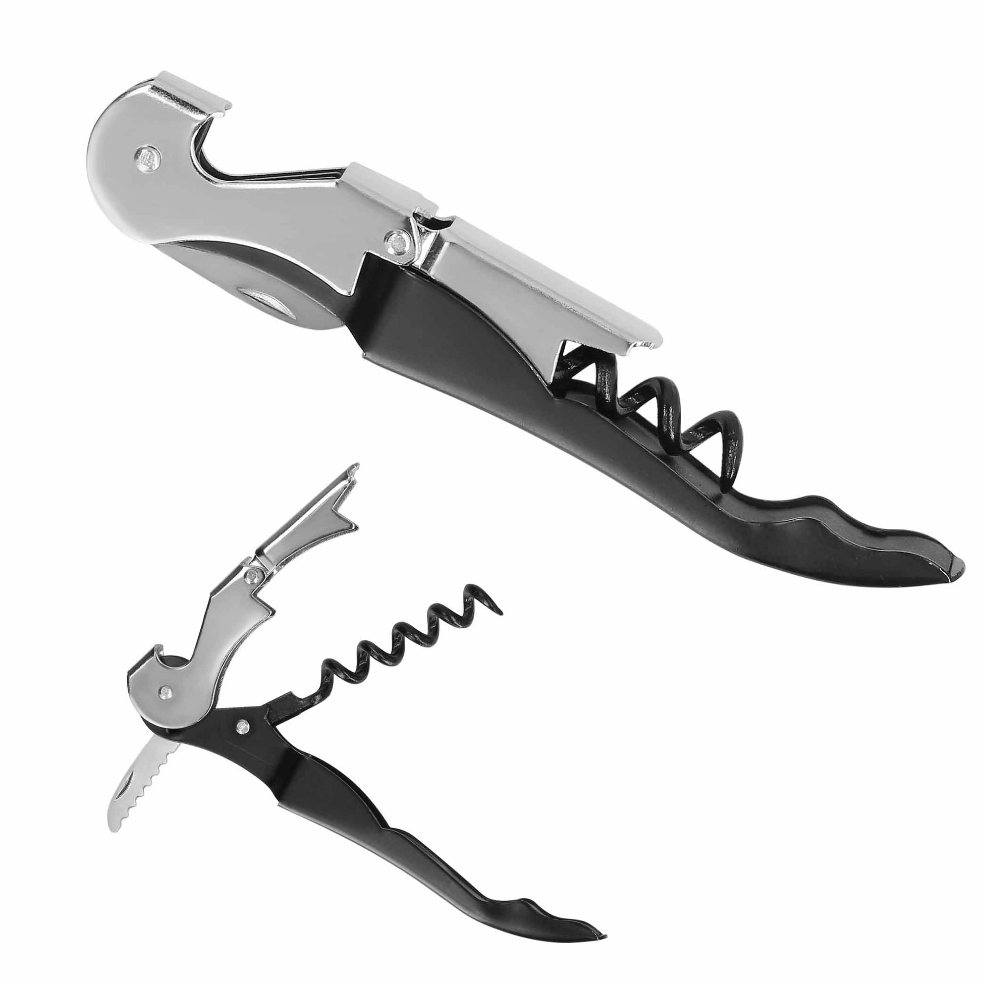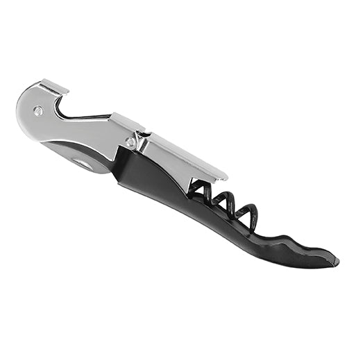 sacacorchos de dos pasos de acero inoxidable con navaja y destapador.