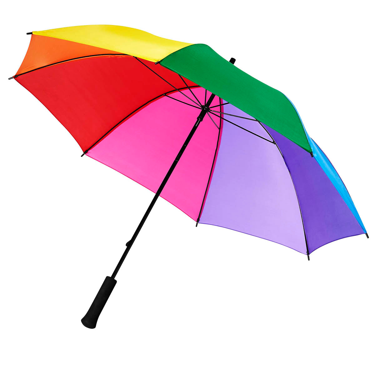 paraguas de 8 paneles, cada panel de un color. sistema manual. mango de esponja. su diseño arcoíris, colorido y alegre refleja la diversidad y la inclusividad.