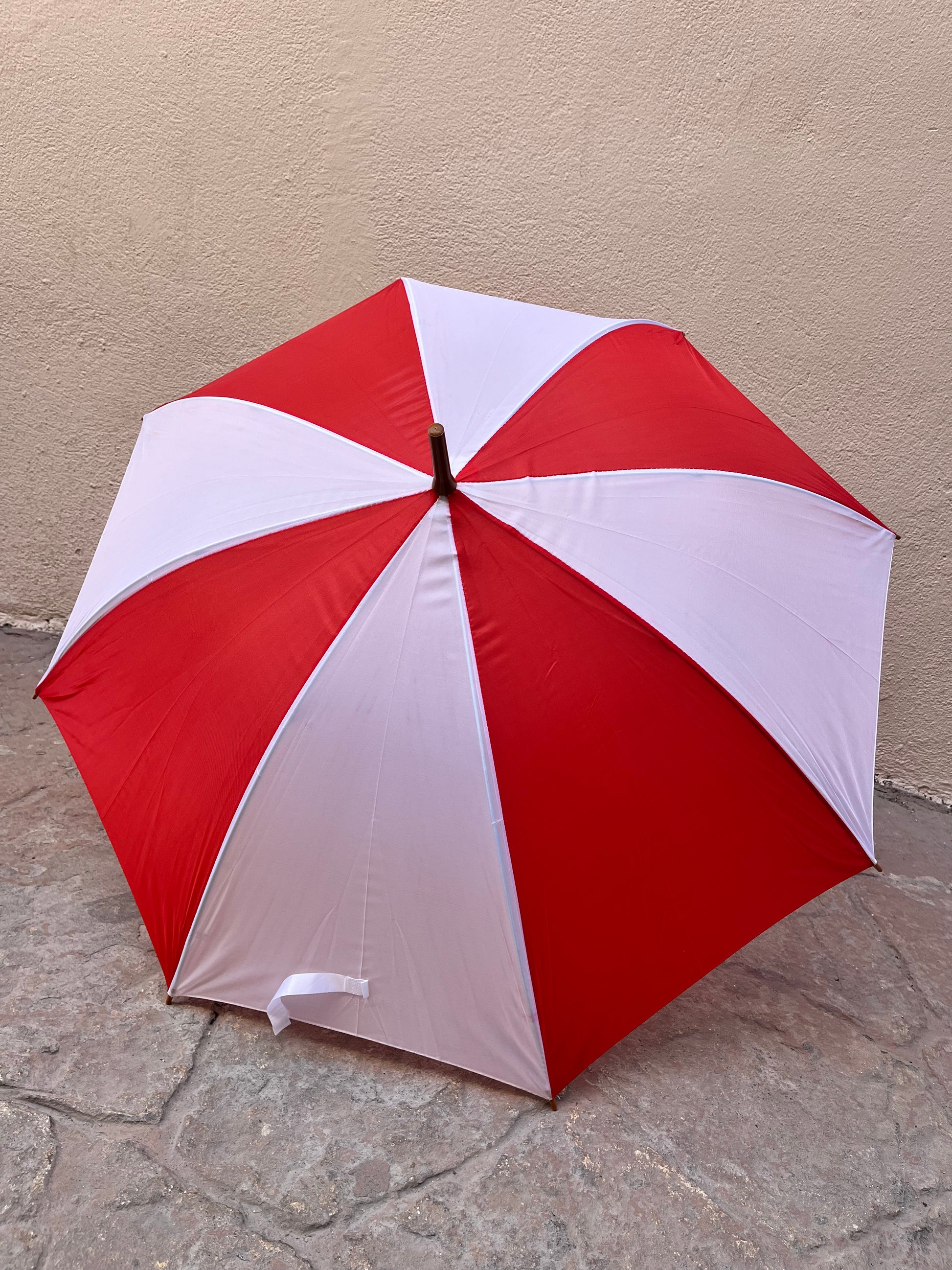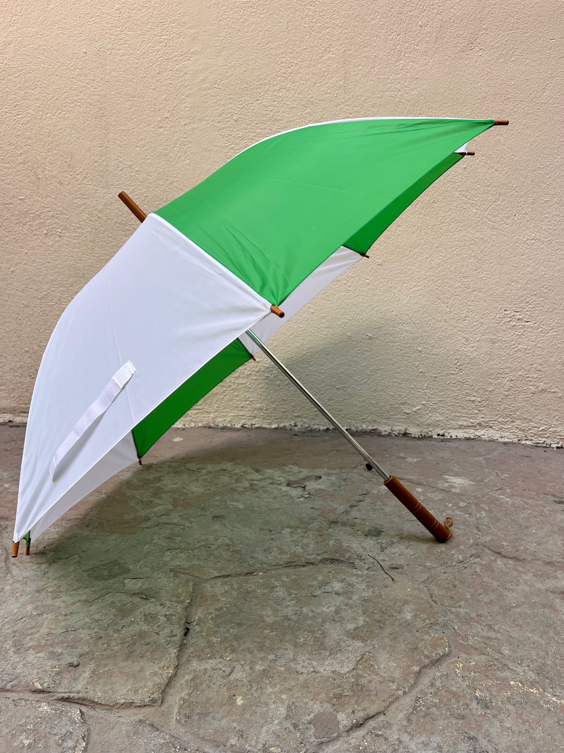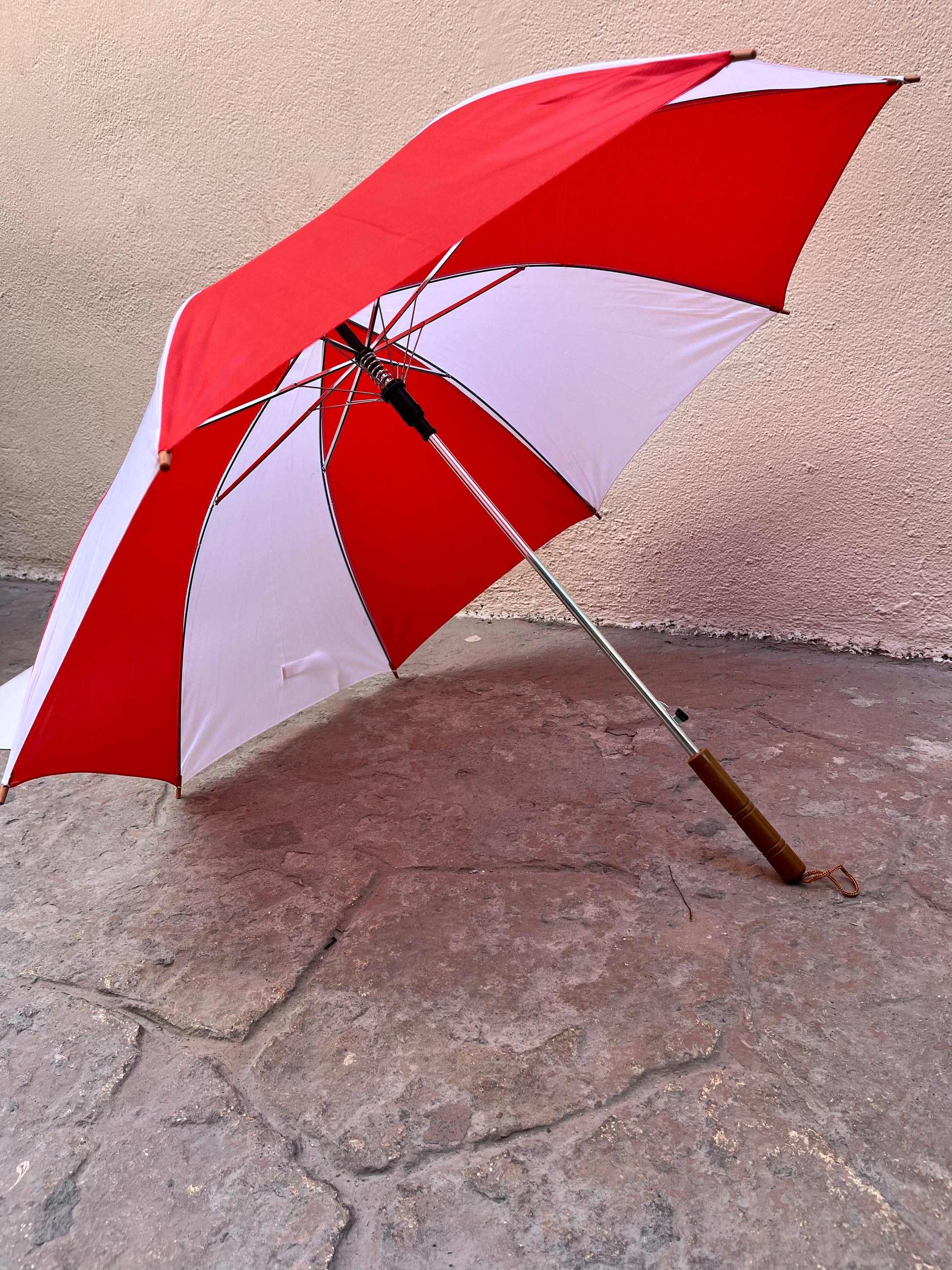 Paraguas mediano de 8 gajos y detalles en plástico color madera.