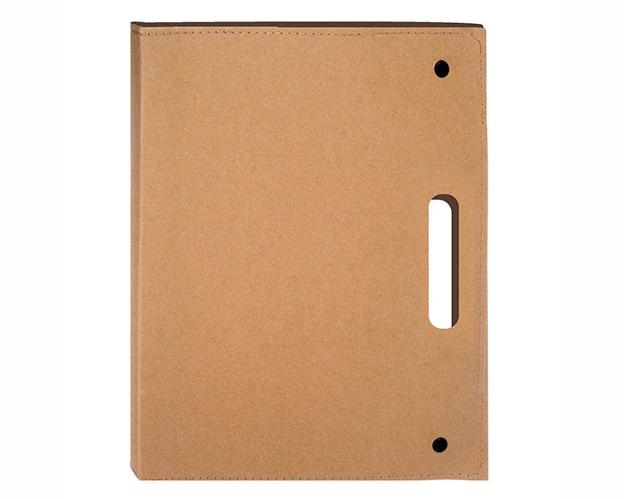 portafolios de cartón con broches de presión, block de 20 hojas rayadas, notas adhesivas y pluma ecológica.