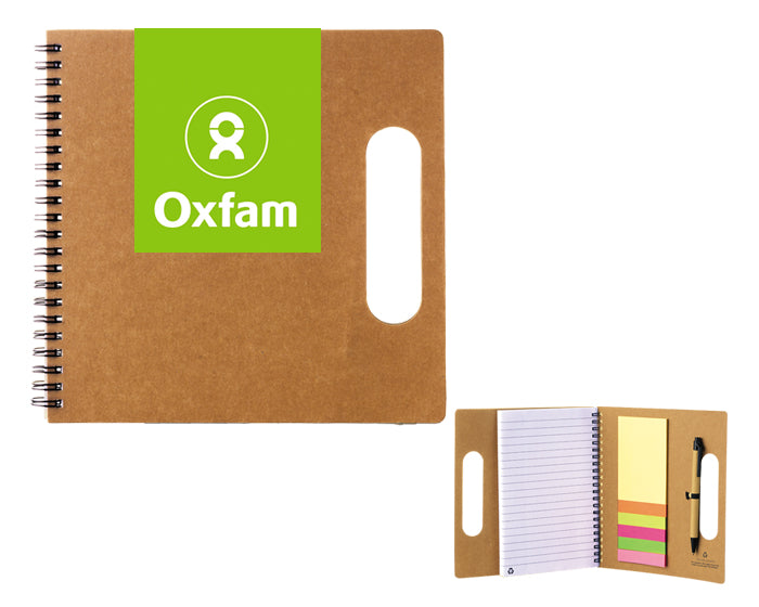 portafolios ecológico con libreta de espiral metálico con 70 hojas rayadas (140 páginas). incluye pluma de papel reciclado y notas adhesivas.