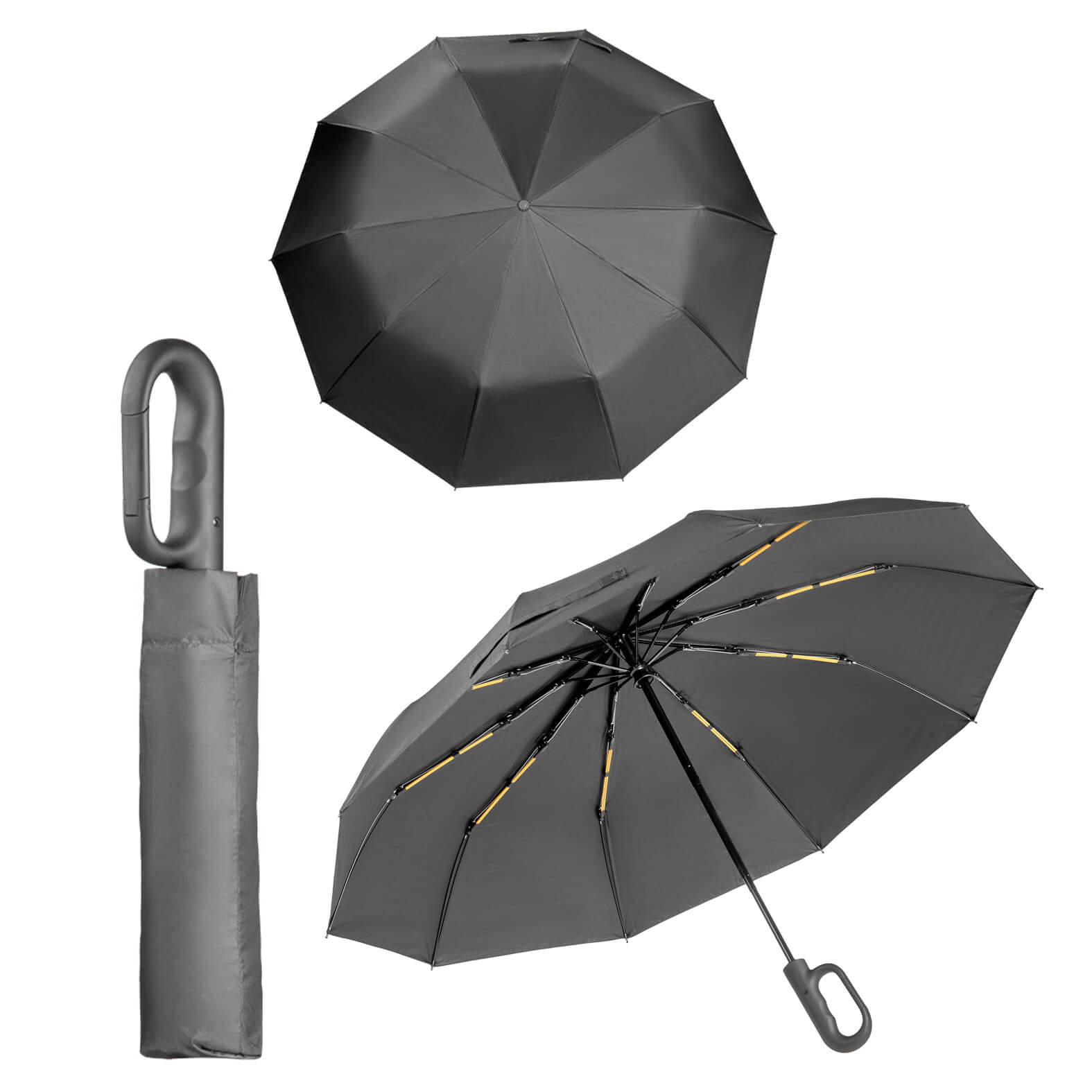 paraguas de bolsillo con sistema de apertura y cierre automático, 10 gajos, broche de velcro, mango con acabado rubber y gancho para bolsas. incluye funda.