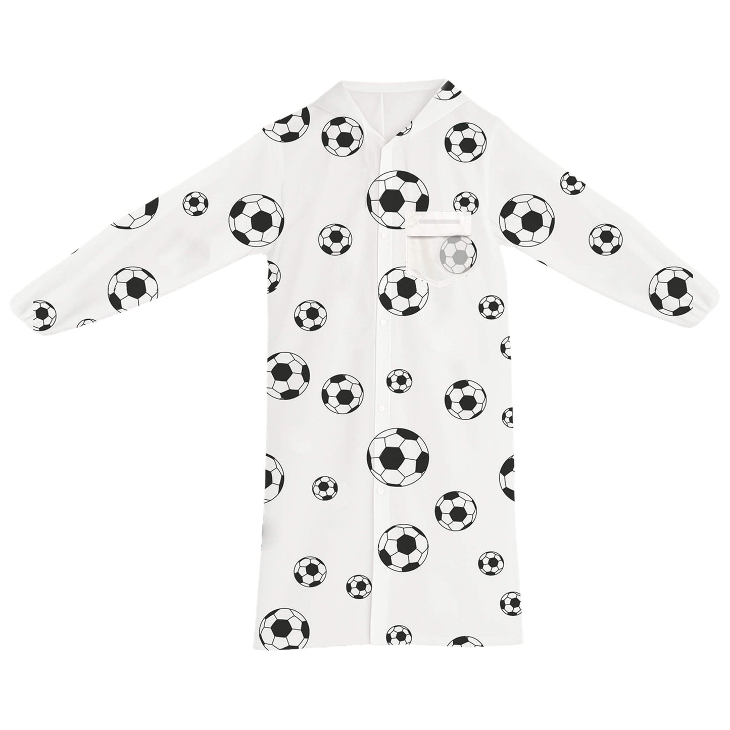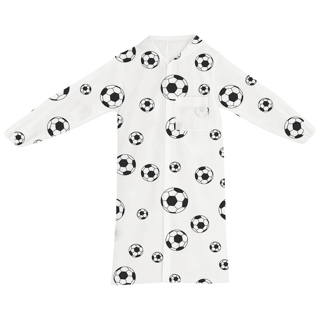 impermeable con print de balones de soccer, con capucha y botones.