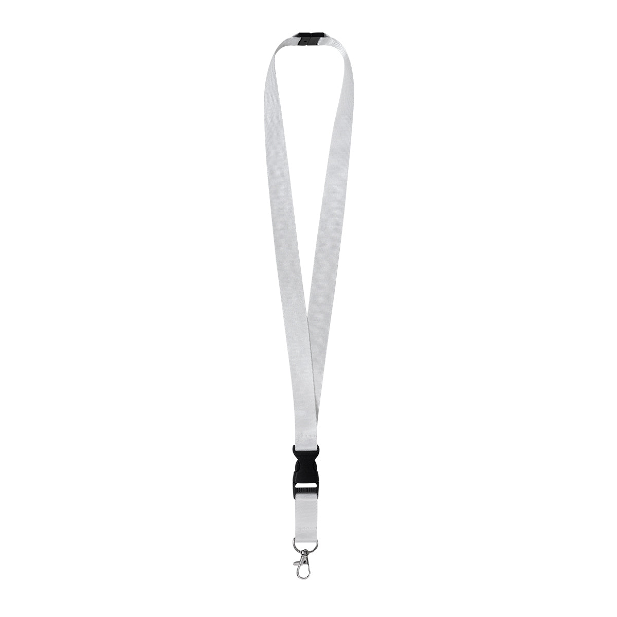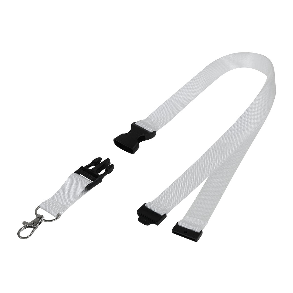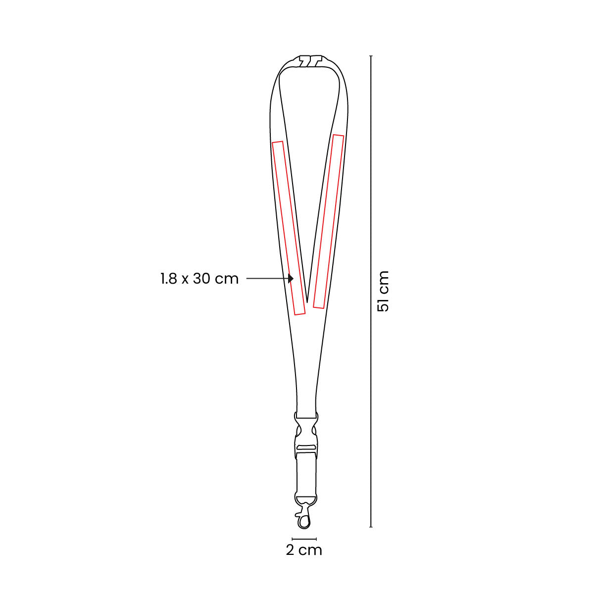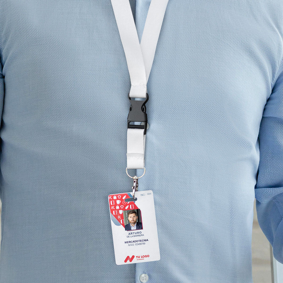 fabricado con material especial para sublimación. incluye broche de seguridad, clip desmontable y gancho metálico con giro de 360°.