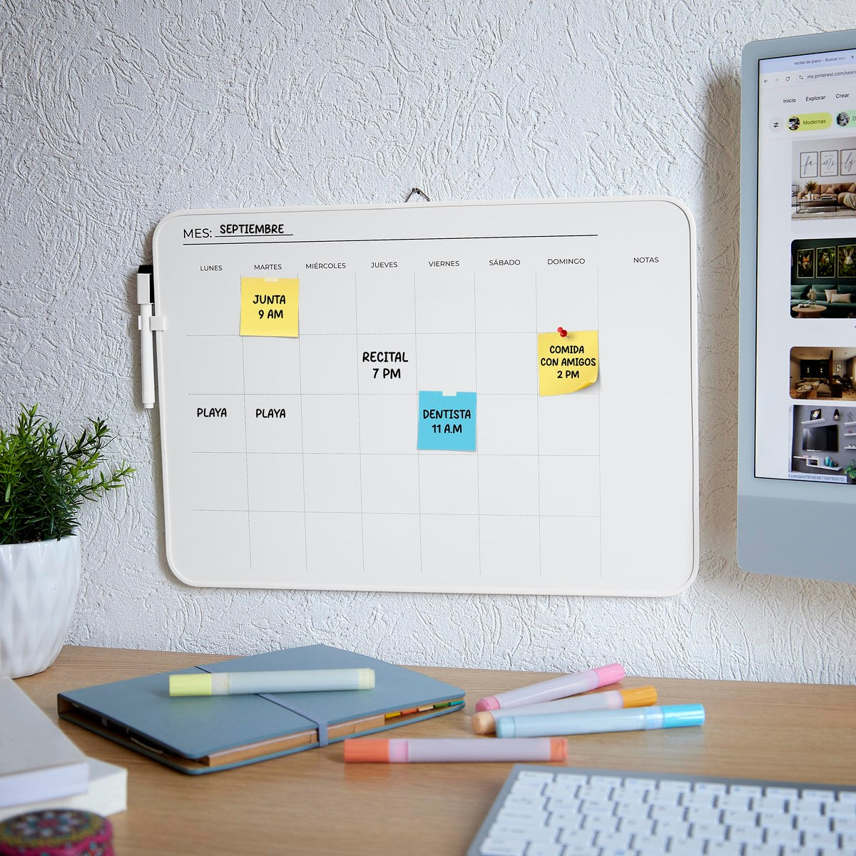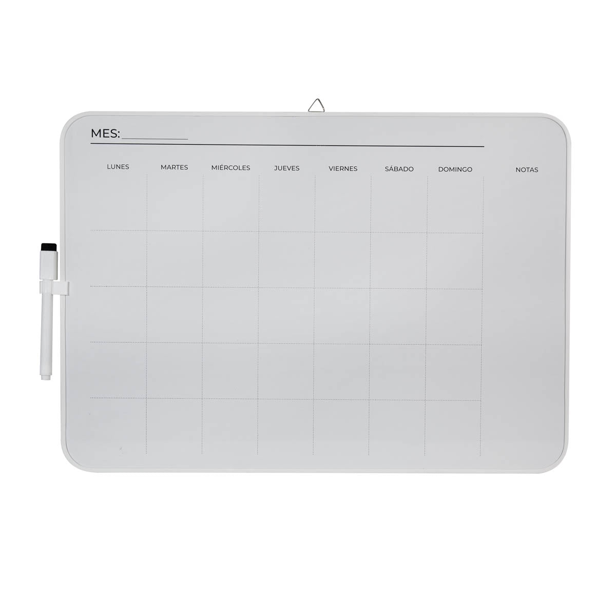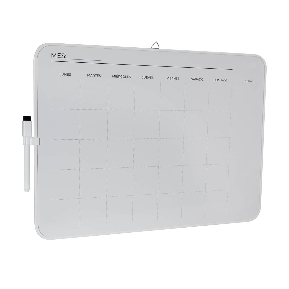 pintarrón con planeador mensual ideal para organizar tus prioridades. incluye marcador con borrador y gancho superior para colgarlo fácilmente en tu espacio de trabajo. su retícula te permite personalizar mes y días, perfecto para uso diario en el hogar, oficina o colegio.