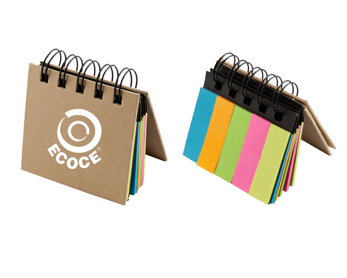 mini block de pasta dura con espiral metálico. contiene 5 blocks de notas adhesivas en colores fosforescentes: amarillo, rosa, naranja, verde, azul y un block de banderas en los mismos colores.