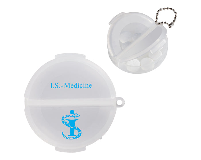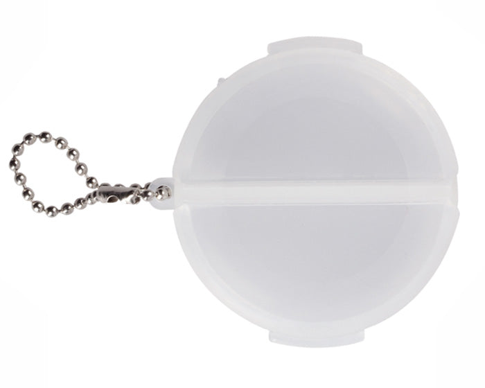pastillero de plástico traslúcido, con doble tapa y dos divisiones, para control de dosis médica. incluye cadena para colgar.