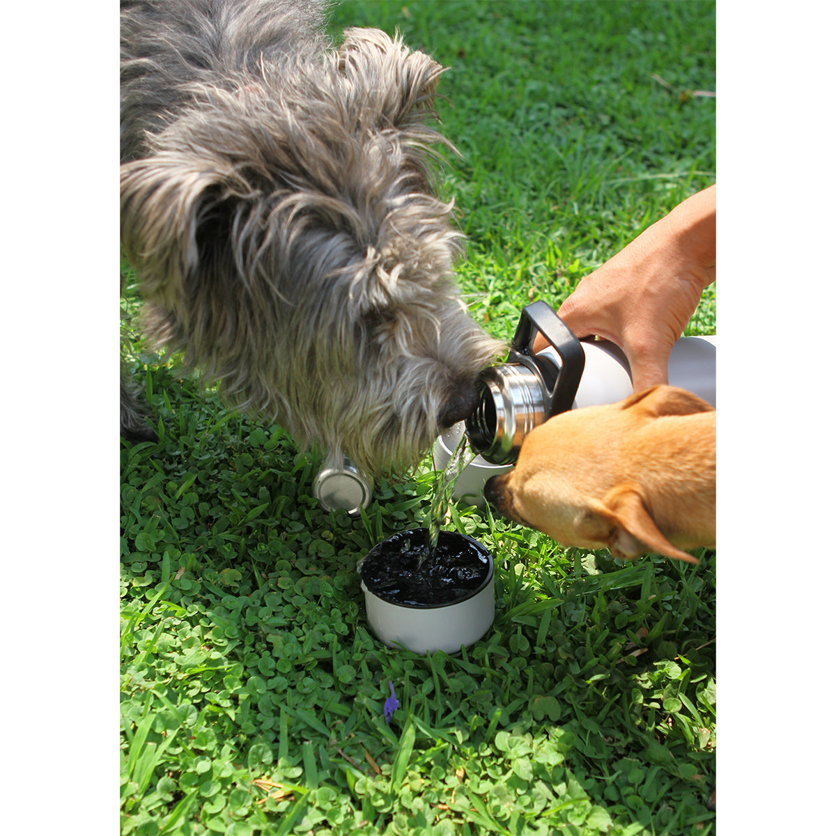 botella doble pared para mascota fabricada en acero inoxidable 201 y 304. con base extraíble para servir comida o agua. incluye caja individual.