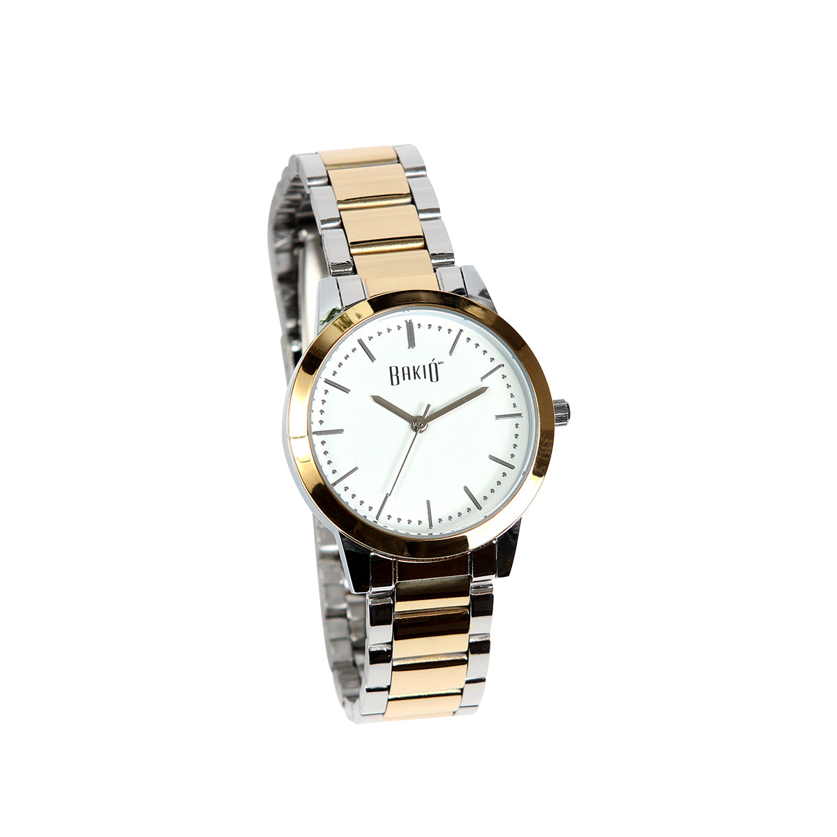 reloj ejecutivo bi -tono línea bakió, fabricado en acero inoxidable, con maquinaria japonesa miyota 2035, resistente al agua. incluye estuche.