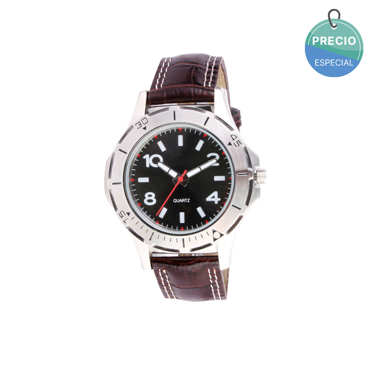 reloj con caja metálica, dial grabado en arillo giratorio y correa de piel. incluye estuche metálico.