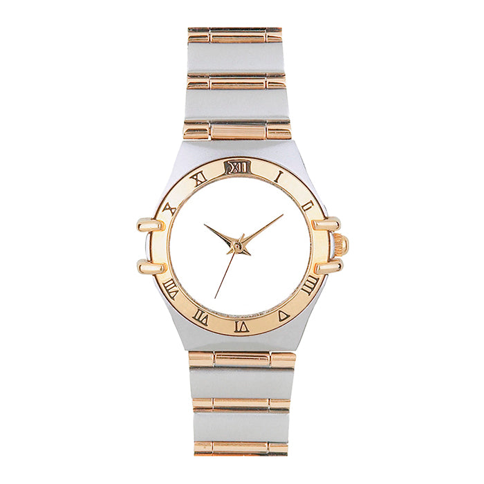 reloj metálico bi-tono, números romanos grabados en el bisel y maquinaria metálica japonesa. incluye estuche metálico individual.
