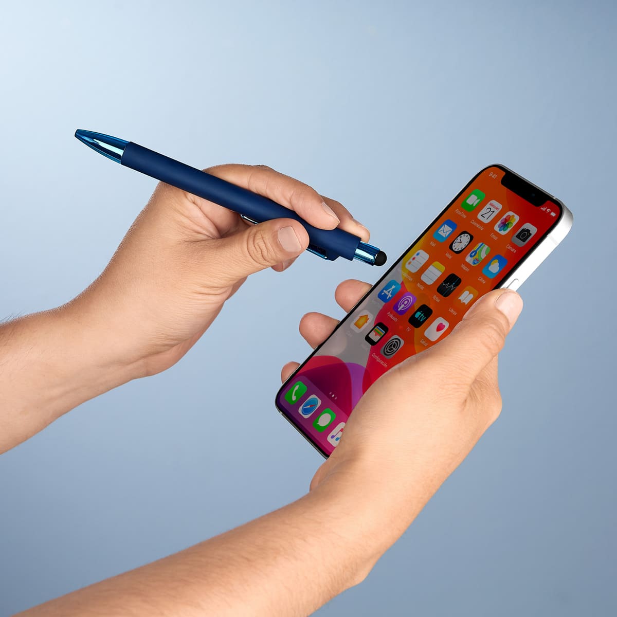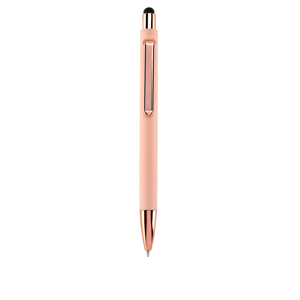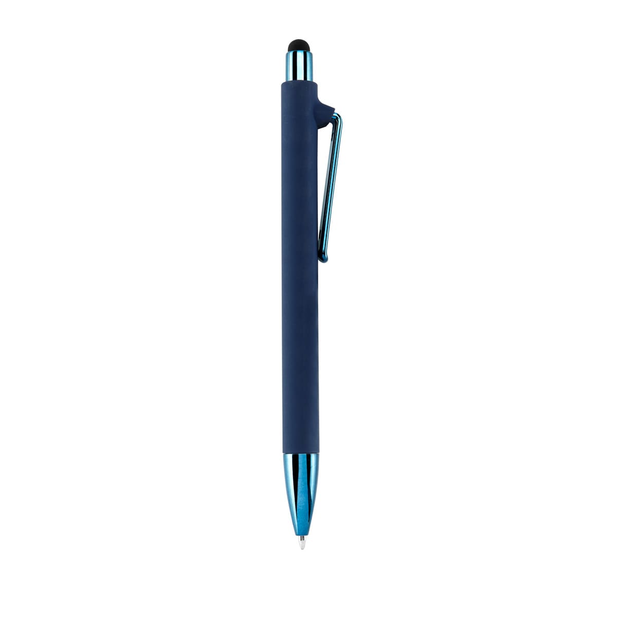 bolígrafo con terminado tipo rubber y touch screen. mecanismo pulsador. botón, clip y punta en color metalizado al tono.